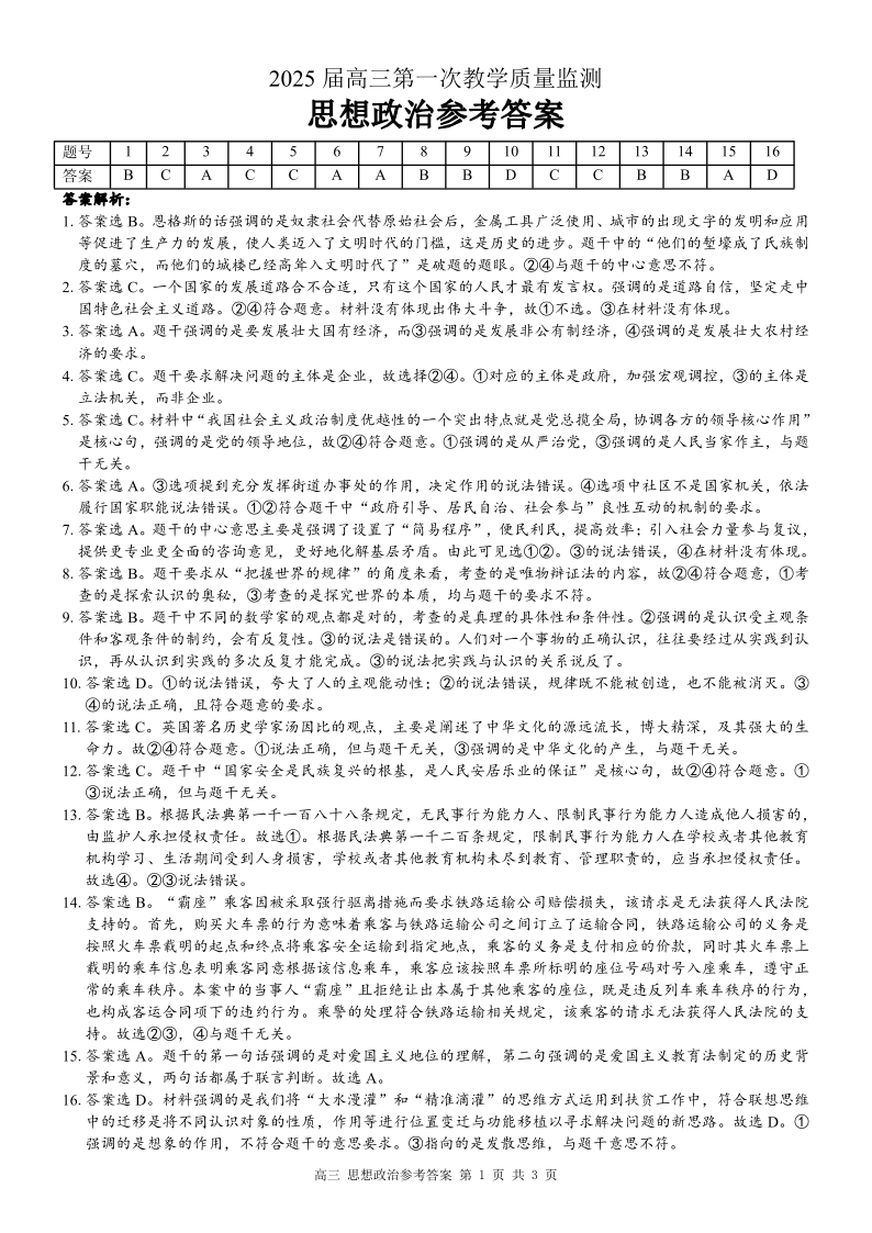 广西省玉林市2025届高三上学期第一次教学质量监测政治答案