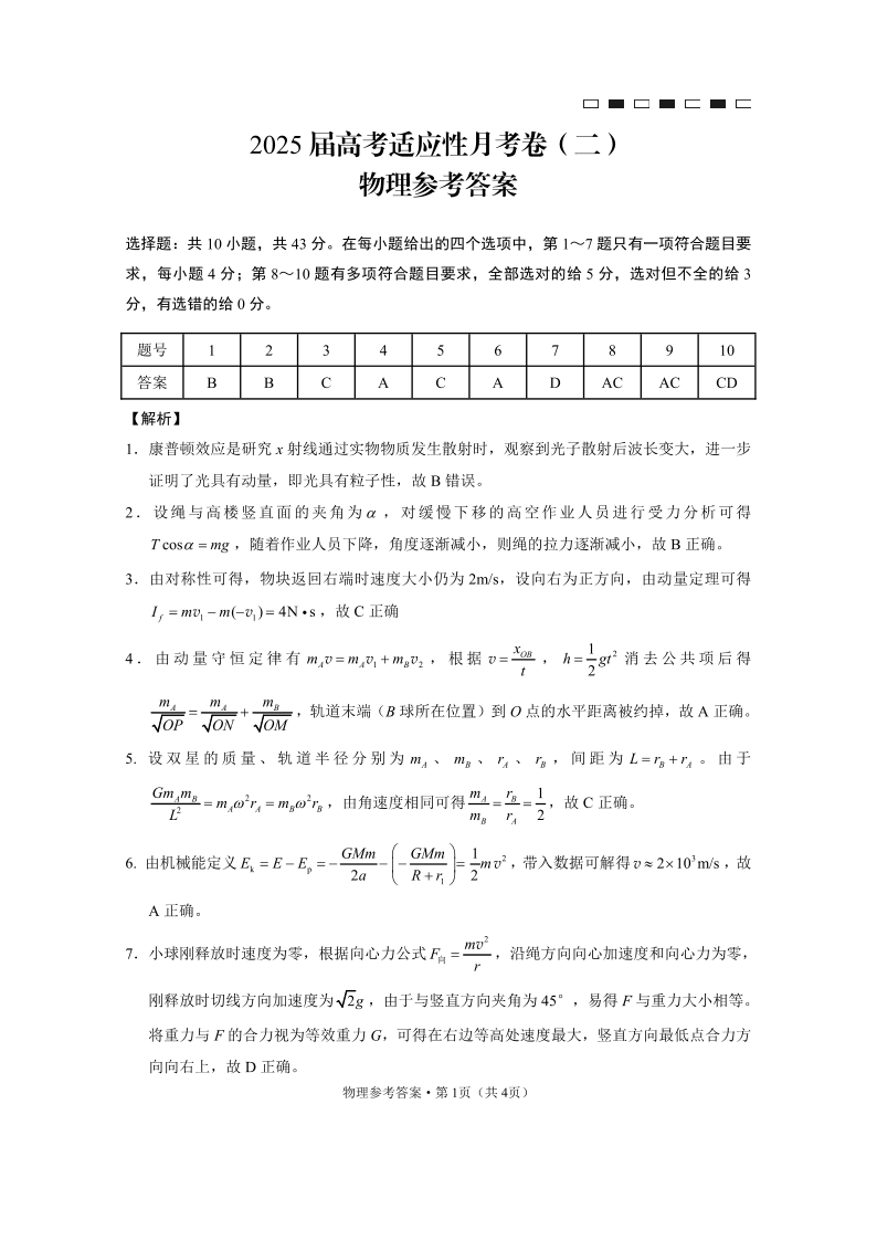 贵州省贵阳市第一中学2025届高三上学期高考适应性月考(二)物理答案