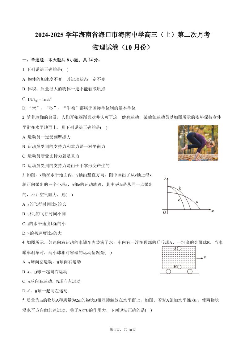 海南省海南中学2025届高三上学期10月月考物理+答案