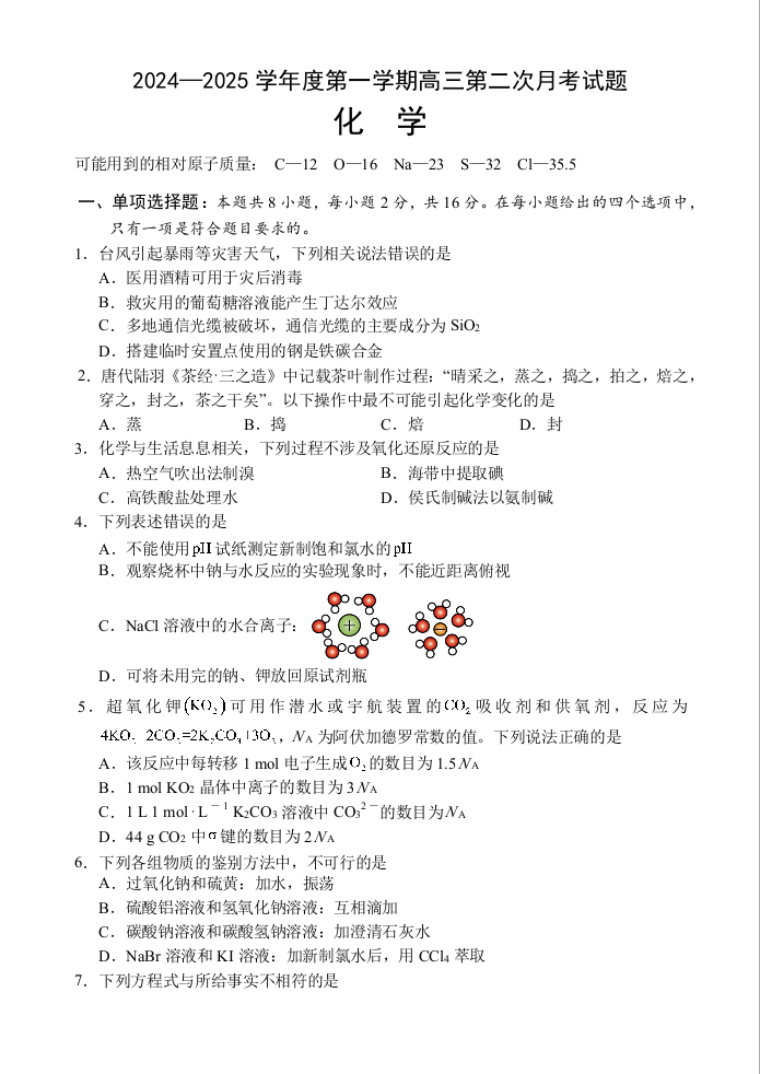 海南省文昌中学2025届高三上学期第二次月考化学+答案