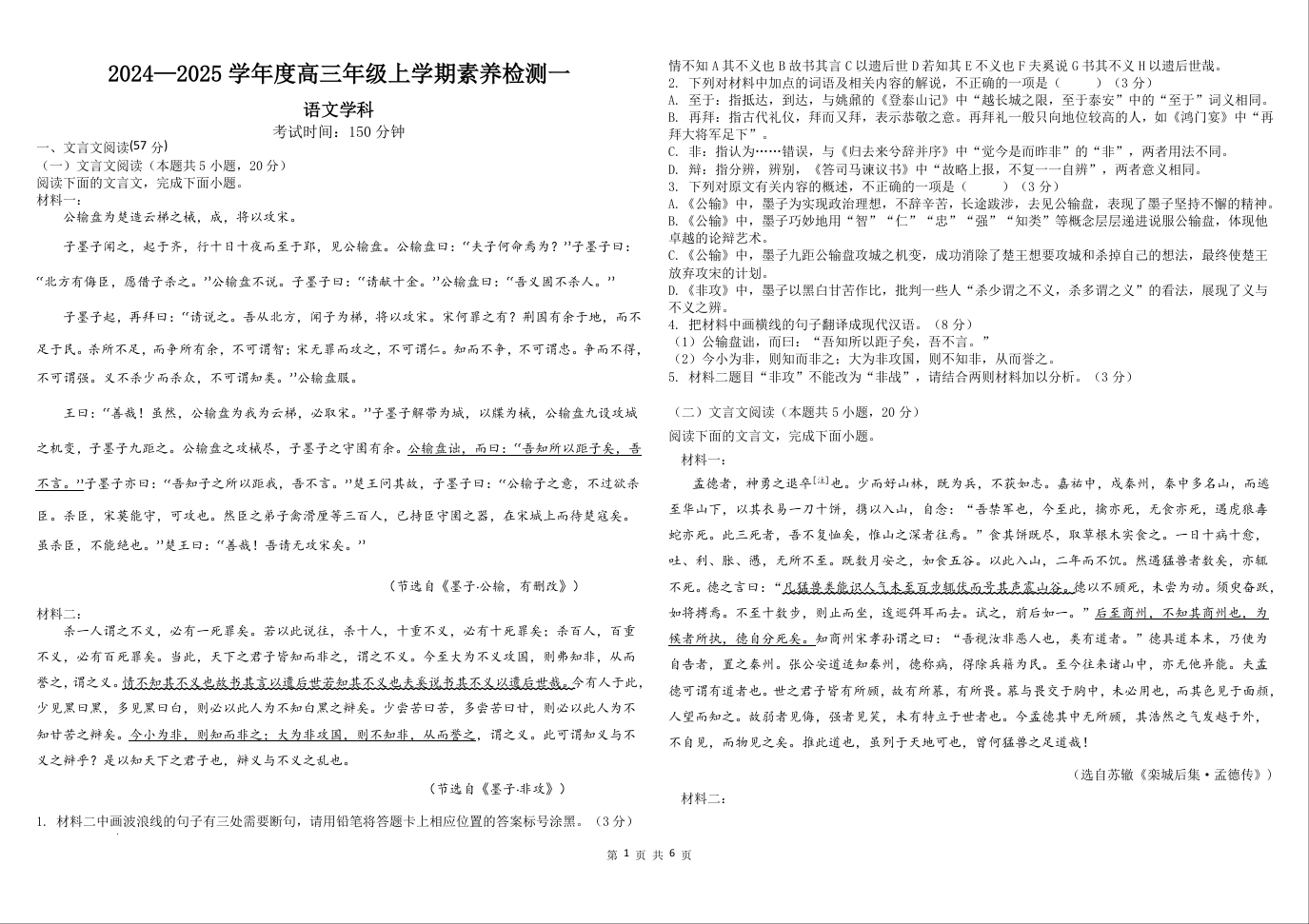 河北省衡水市第二中学2025届高三上学期素养检测(一)语文