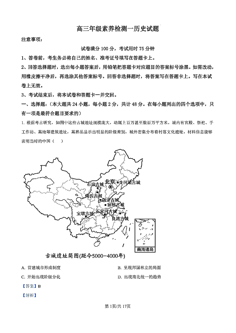 河北省衡水市第二中学2025届高三上学期素养检测(一)历史(解析版)