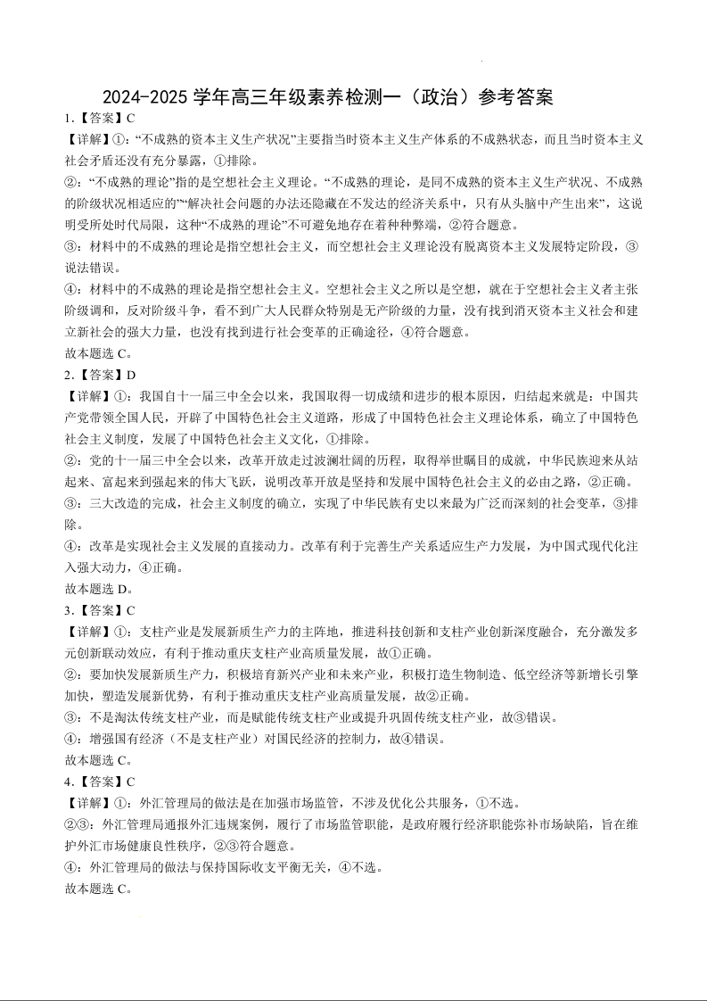 河北省衡水市第二中学2025届高三上学期素养检测(一)政治答案