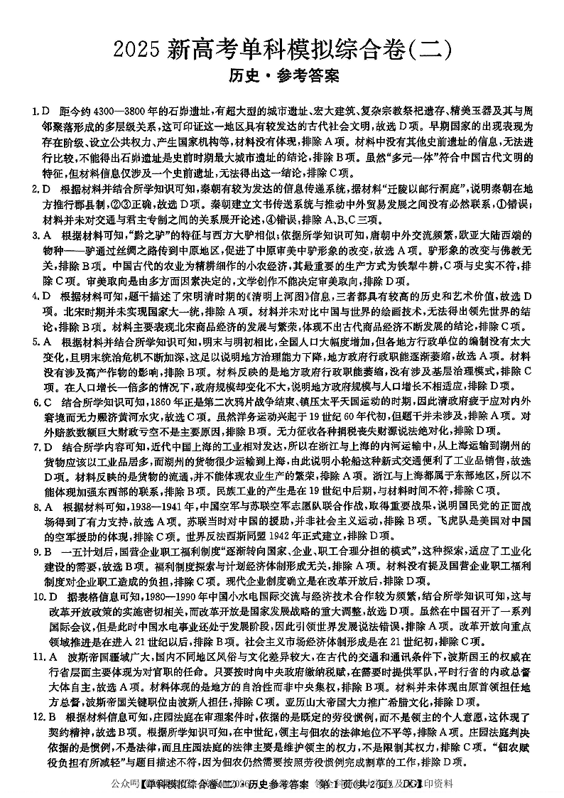 河北省2025届高三上学期新高考单科模拟综合卷(二)历史答案