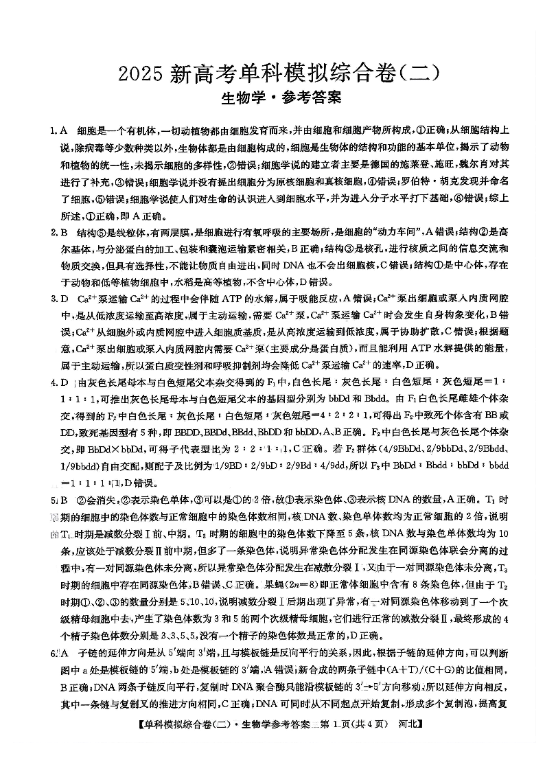 河北省2025届高三上学期新高考单科模拟综合卷(二)生物答案