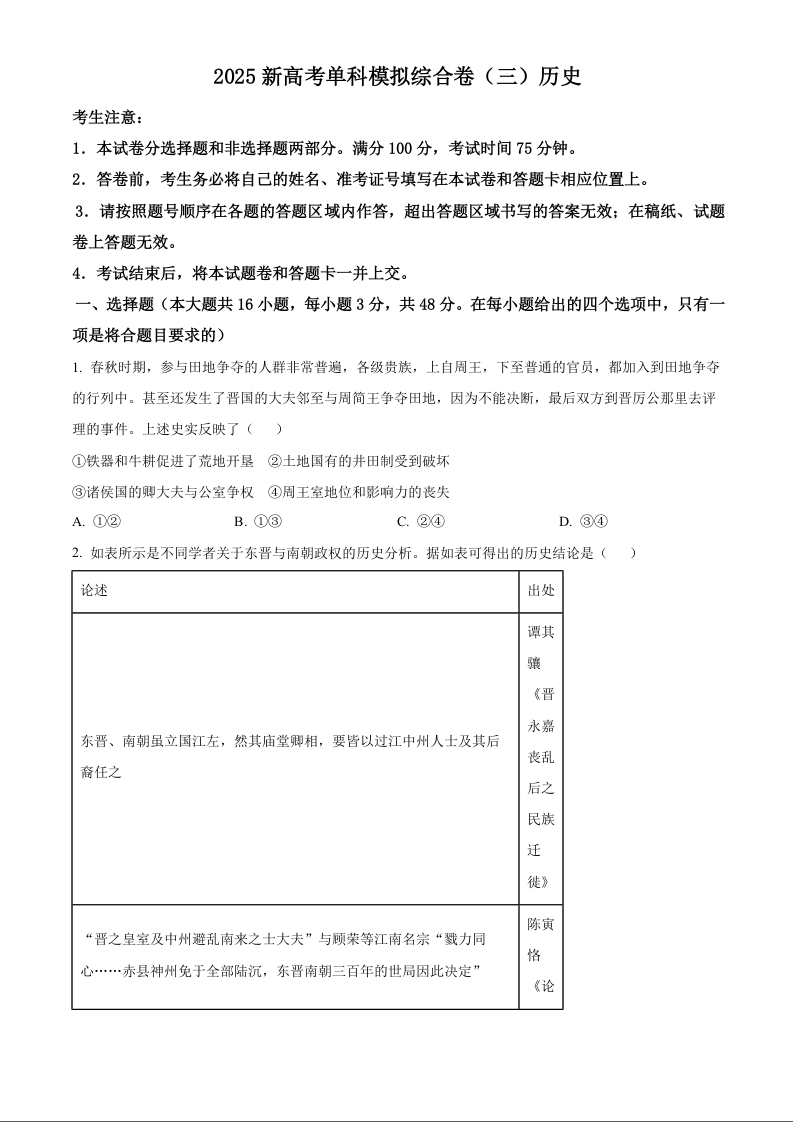 河北省2025届高三上学期新高考单科模拟综合卷(三)历史+答案