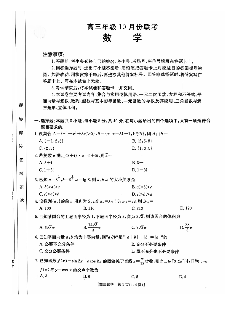河北省部分高中2025届10月高三联考数学