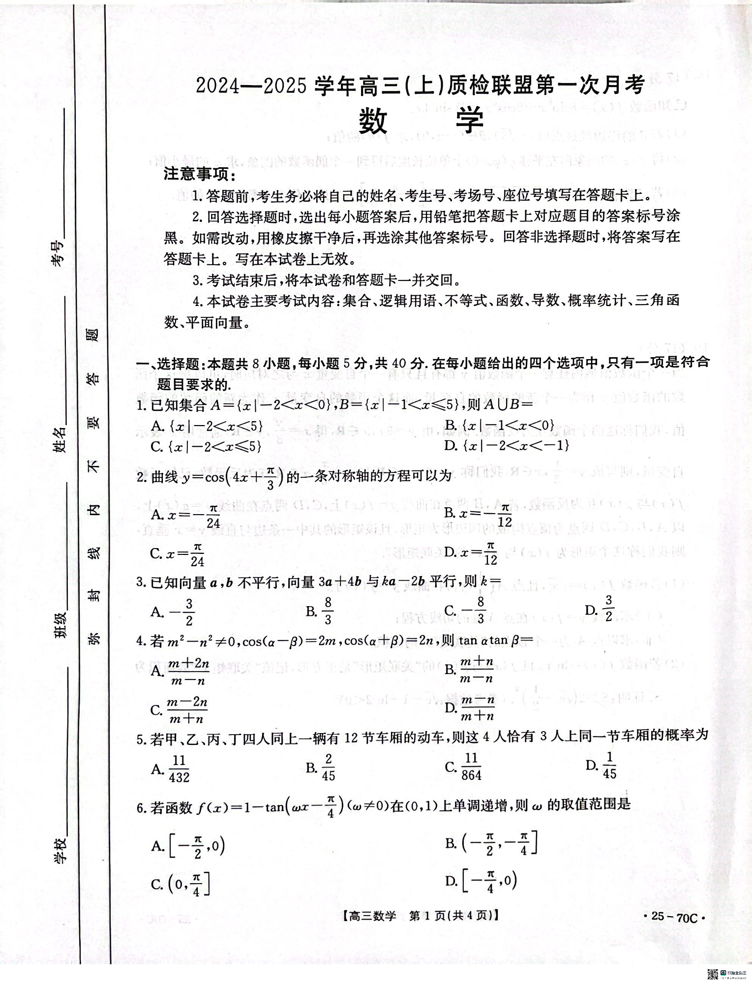 河北省邢台市2024-2025学年高三(上)质检联盟第一次月考数学