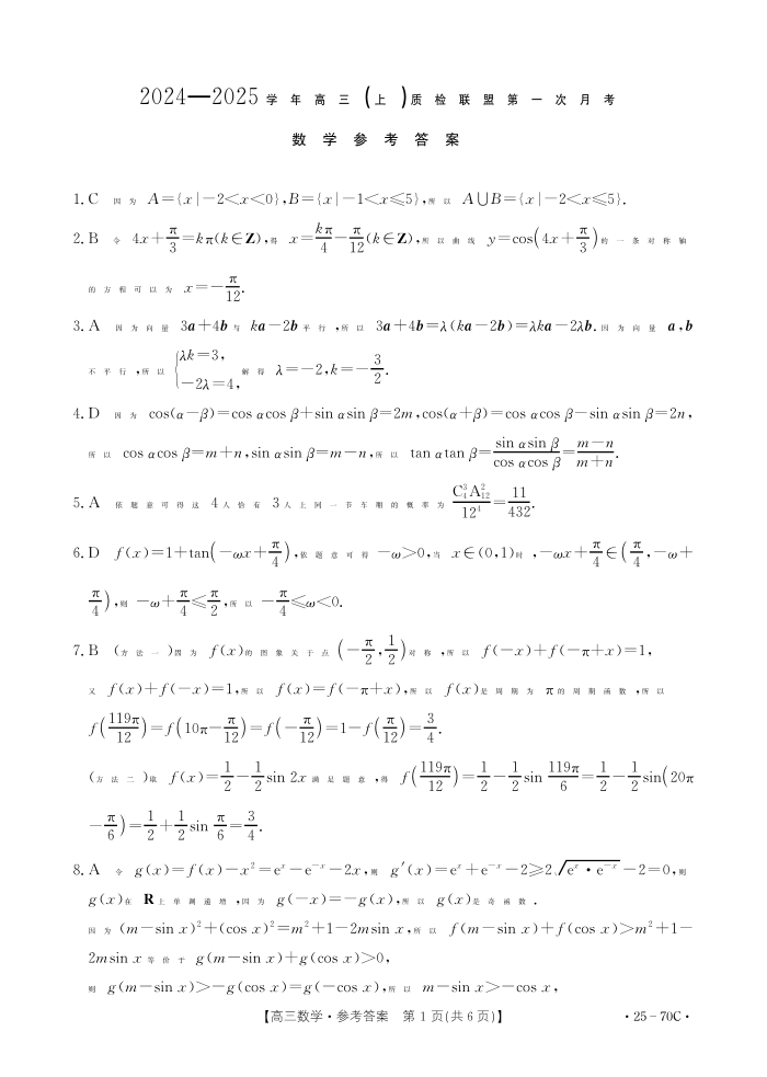 河北省邢台市2024-2025学年高三(上)质检联盟第一次月考数学答案