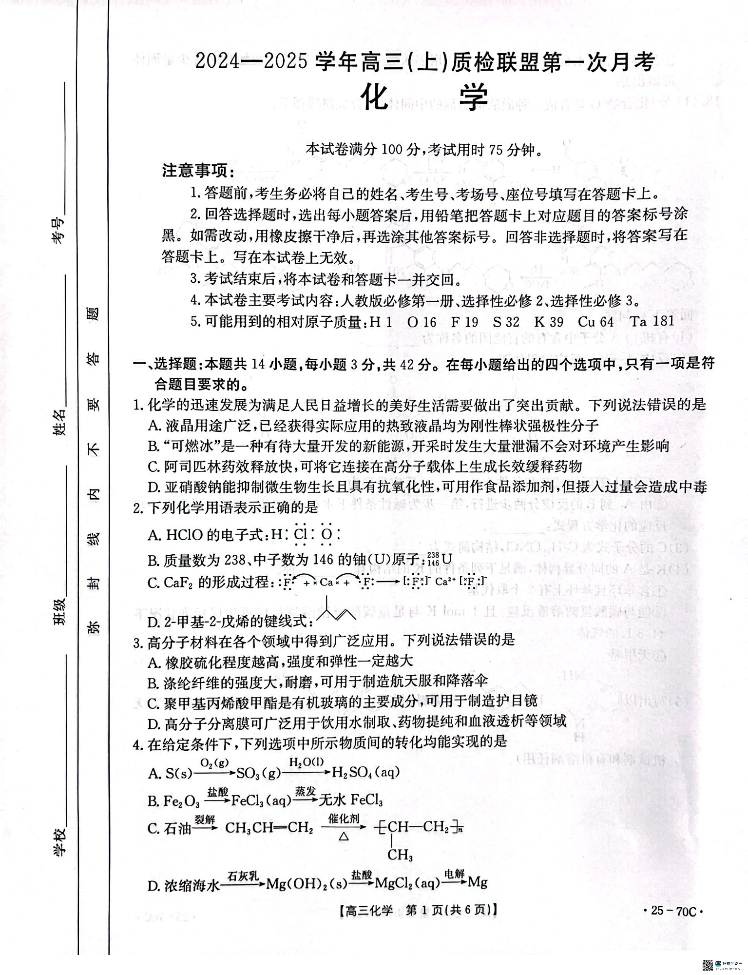 河北省邢台市2024-2025学年高三(上)质检联盟第一次月考化学