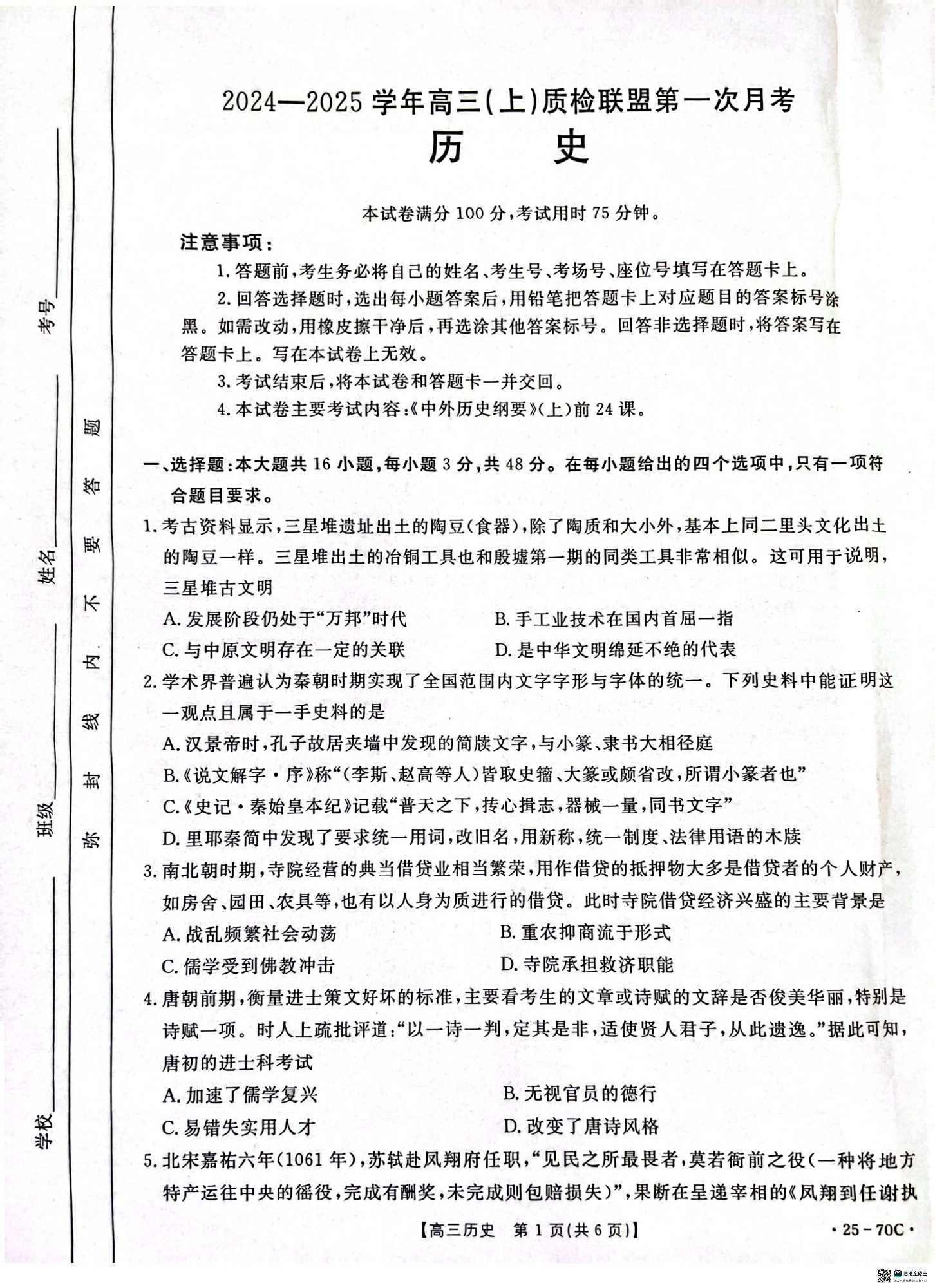 河北省邢台市2024-2025学年高三(上)质检联盟第一次月考历史