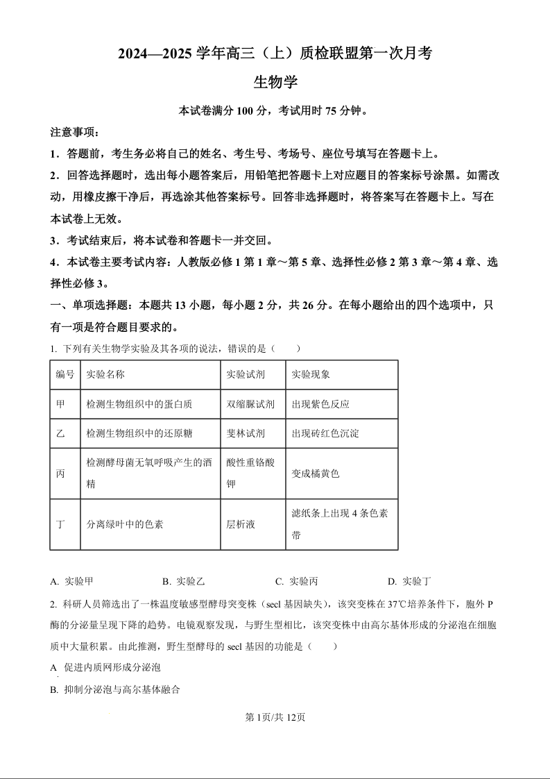 河北省邢台市2024-2025学年高三(上)质检联盟第一次月考生物试题(原卷版)