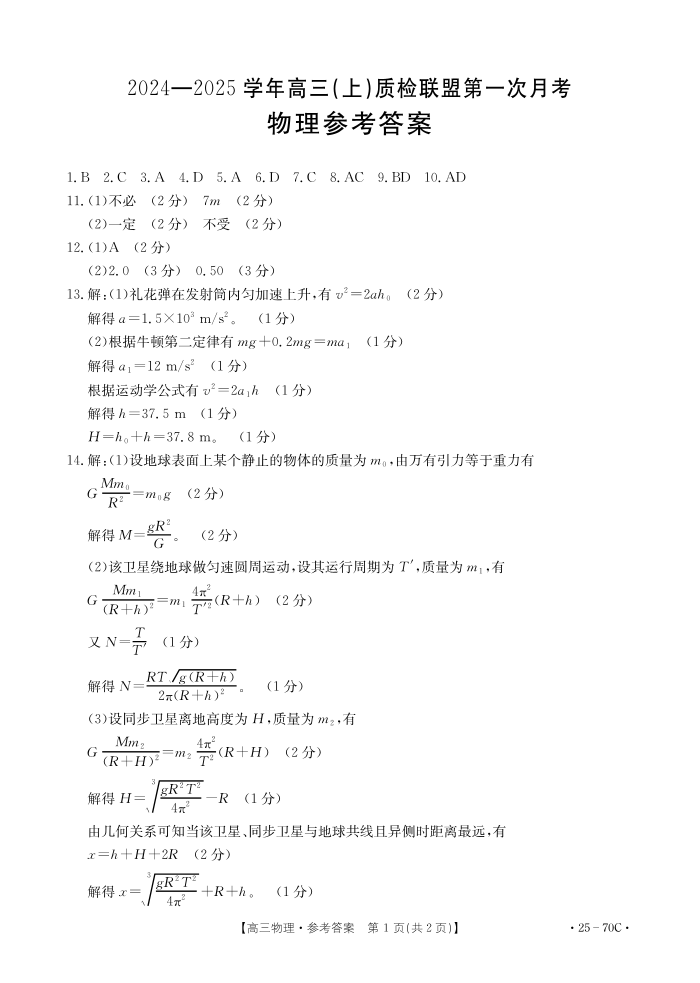 河北省邢台市2024-2025学年高三(上)质检联盟第一次月考物理答案