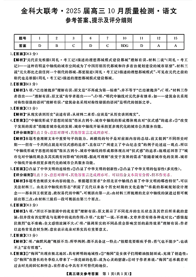 河南省2025届高三10月统一模拟考试语文答案