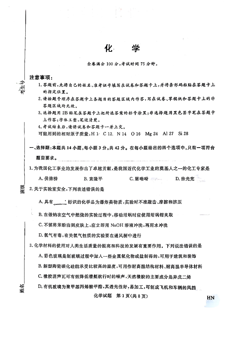 河南省2025届高三10月统一模拟考试化学