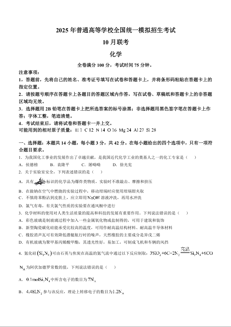 河南省2025届高三10月统一模拟考试化学试卷+答案