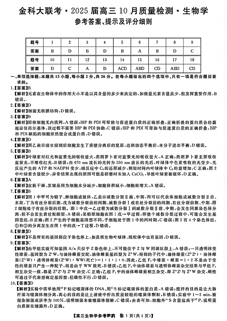 河南省2025届高三10月统一模拟考试生物答案