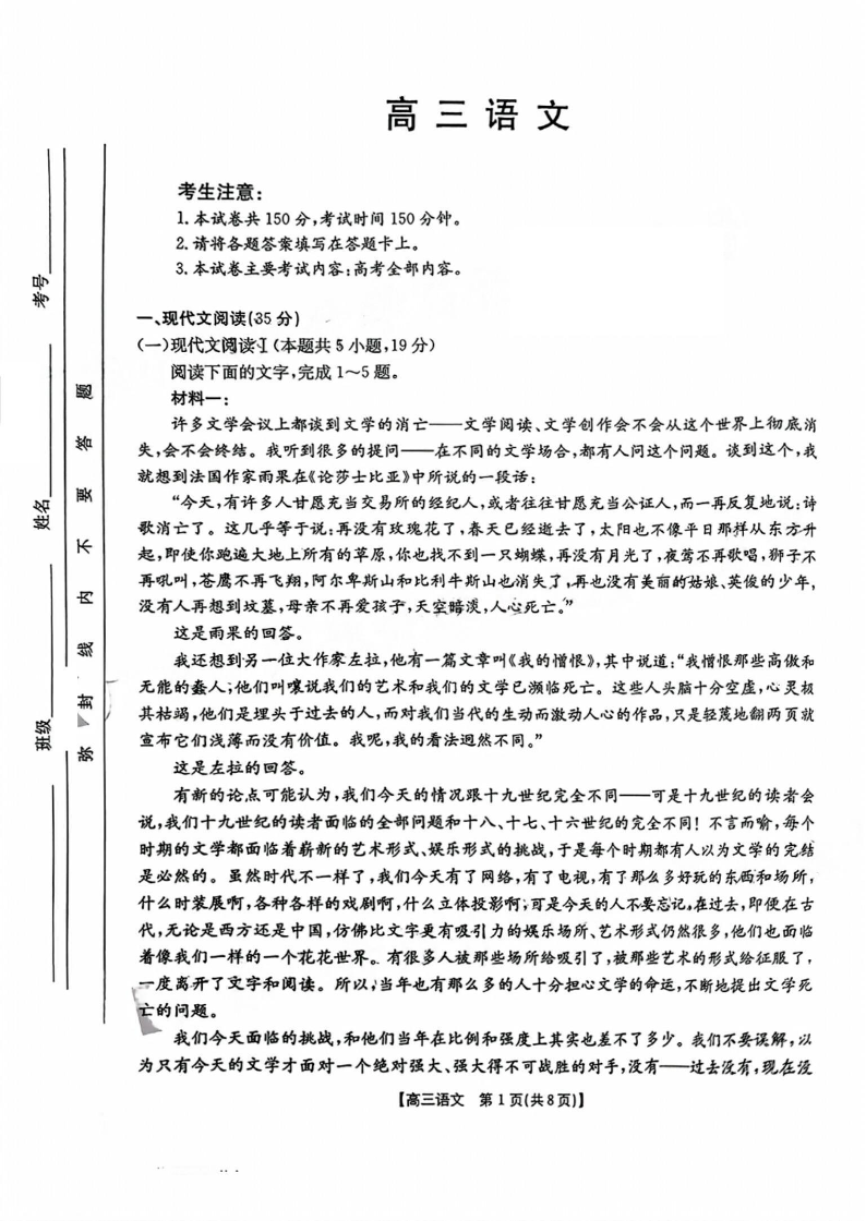 河南省部分高中2024-2025年高三年级联考(三)语文