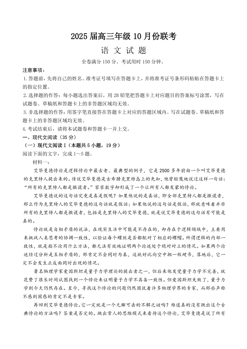 河南省衡水2025届高三年级10月份大联考语文+答案
