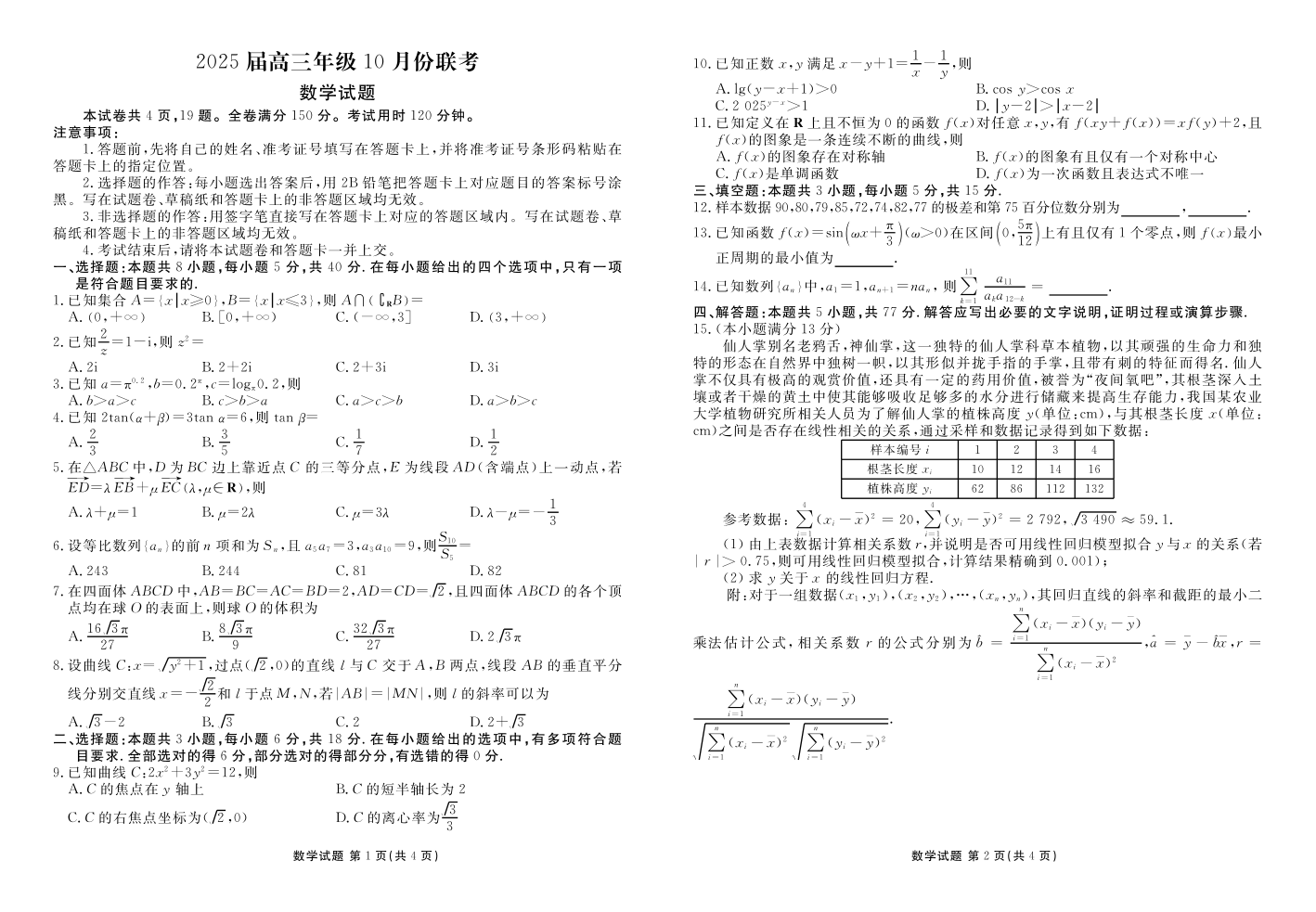 河南省衡水2025届高三年级10月份大联考数学+答案