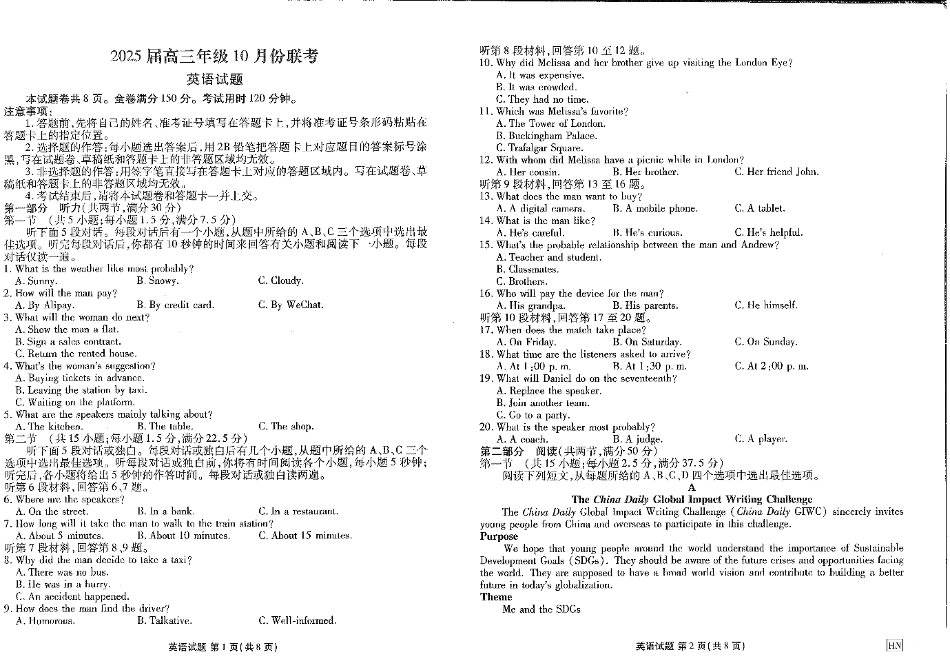 河南省衡水2025届高三年级10月份大联考英语+答案
