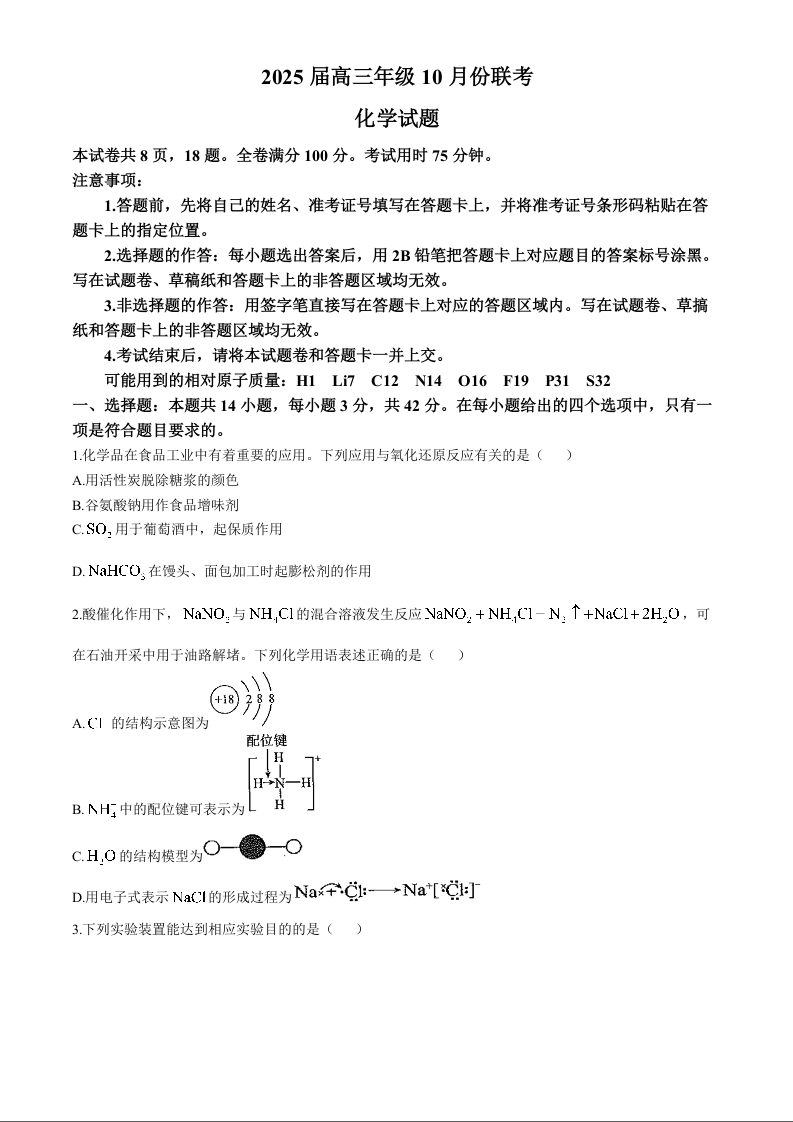 河南省衡水2025届高三年级10月份大联考化学+答案