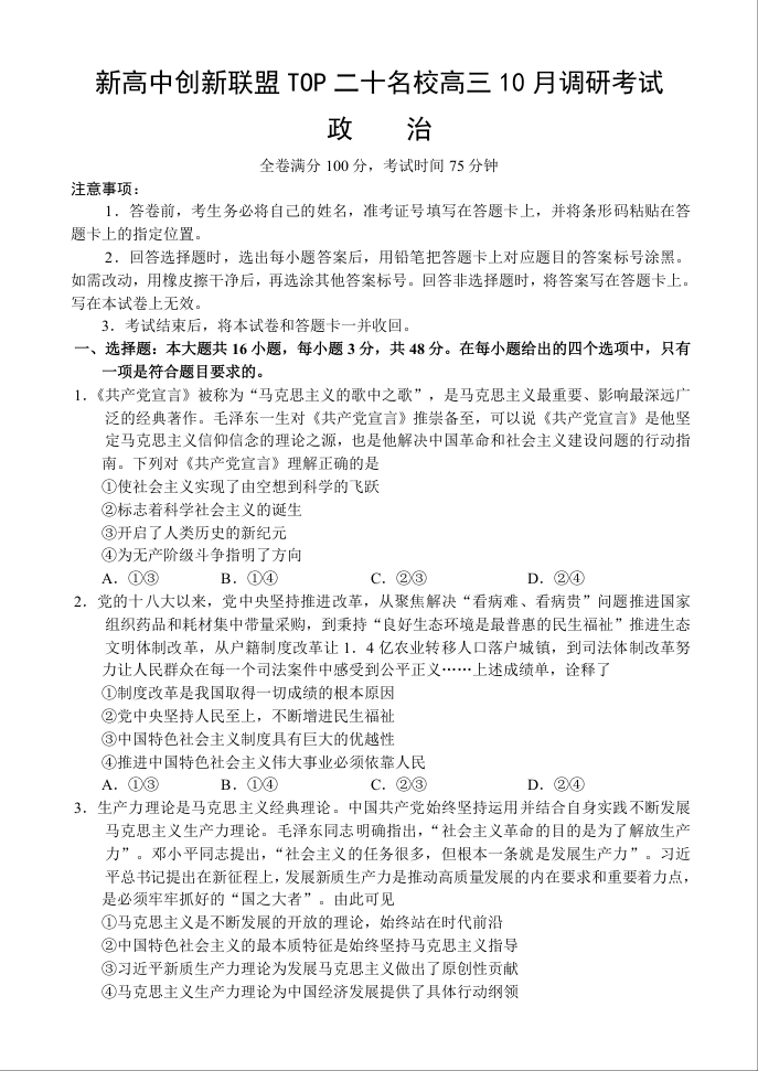 河南省新高中创新联盟TOP二十名校2025届高三上学期10月调研考试(一)政治