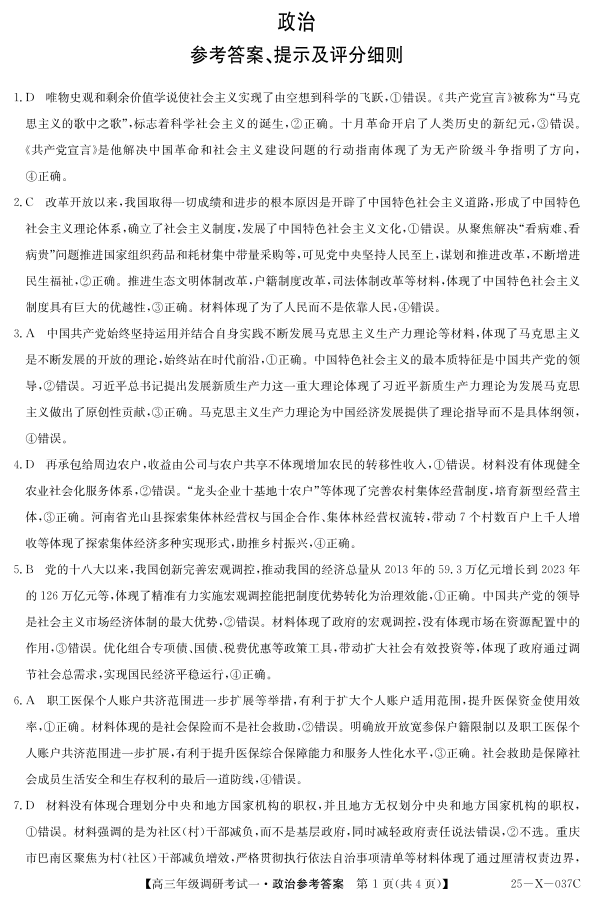河南省新高中创新联盟TOP二十名校2025届高三上学期10月调研考试(一)政治答案
