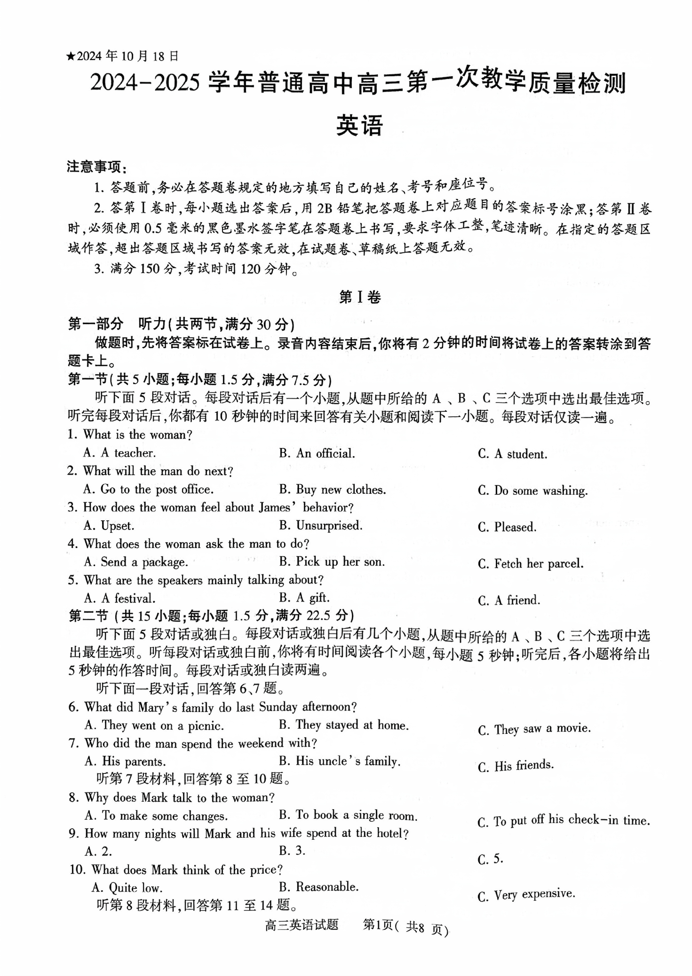 河南省信阳市2024-2025学年普通高中高三第一次教学教学质量检测 英语