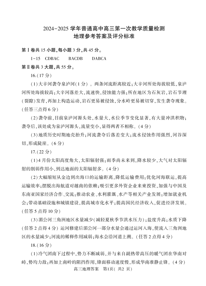 河南省信阳市2024-2025学年普通高中高三第一次教学教学质量检测 地理答案