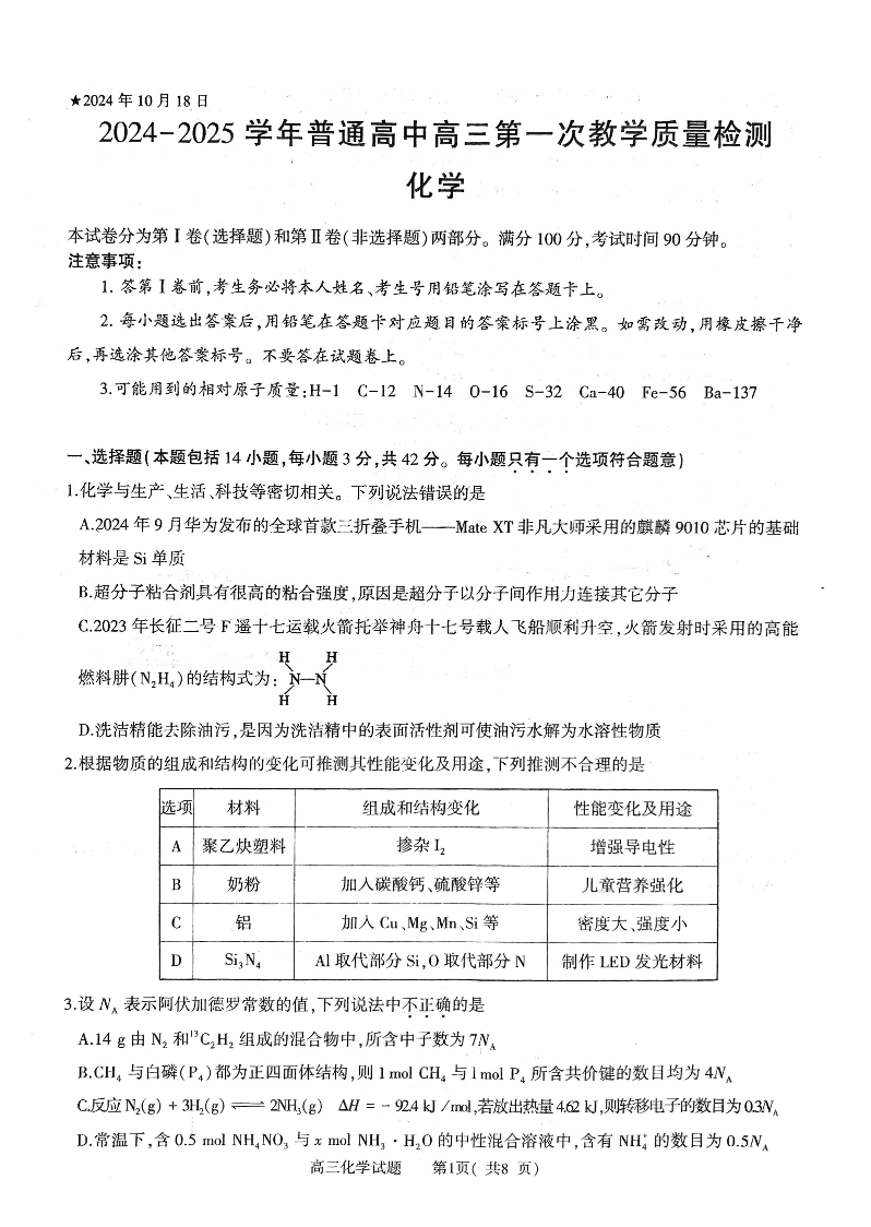 河南省信阳市2024-2025学年普通高中高三第一次教学教学质量检测 化学