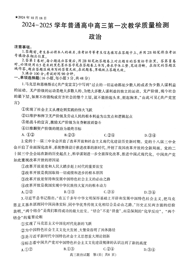 河南省信阳市2024-2025学年普通高中高三第一次教学教学质量检测 政治