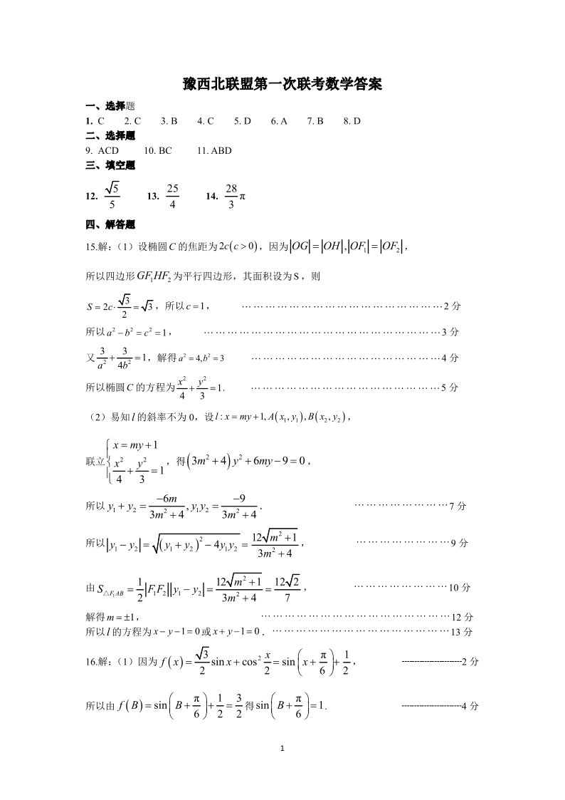 河南省豫西北教研联盟2025届高三上学期第一次质量检测数学答案