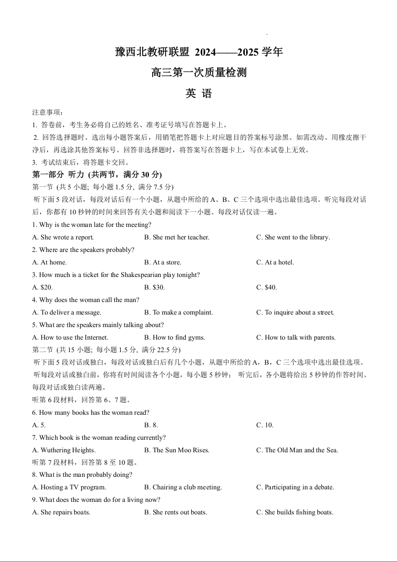 河南省豫西北教研联盟2025届高三上学期第一次质量检测英语+答案