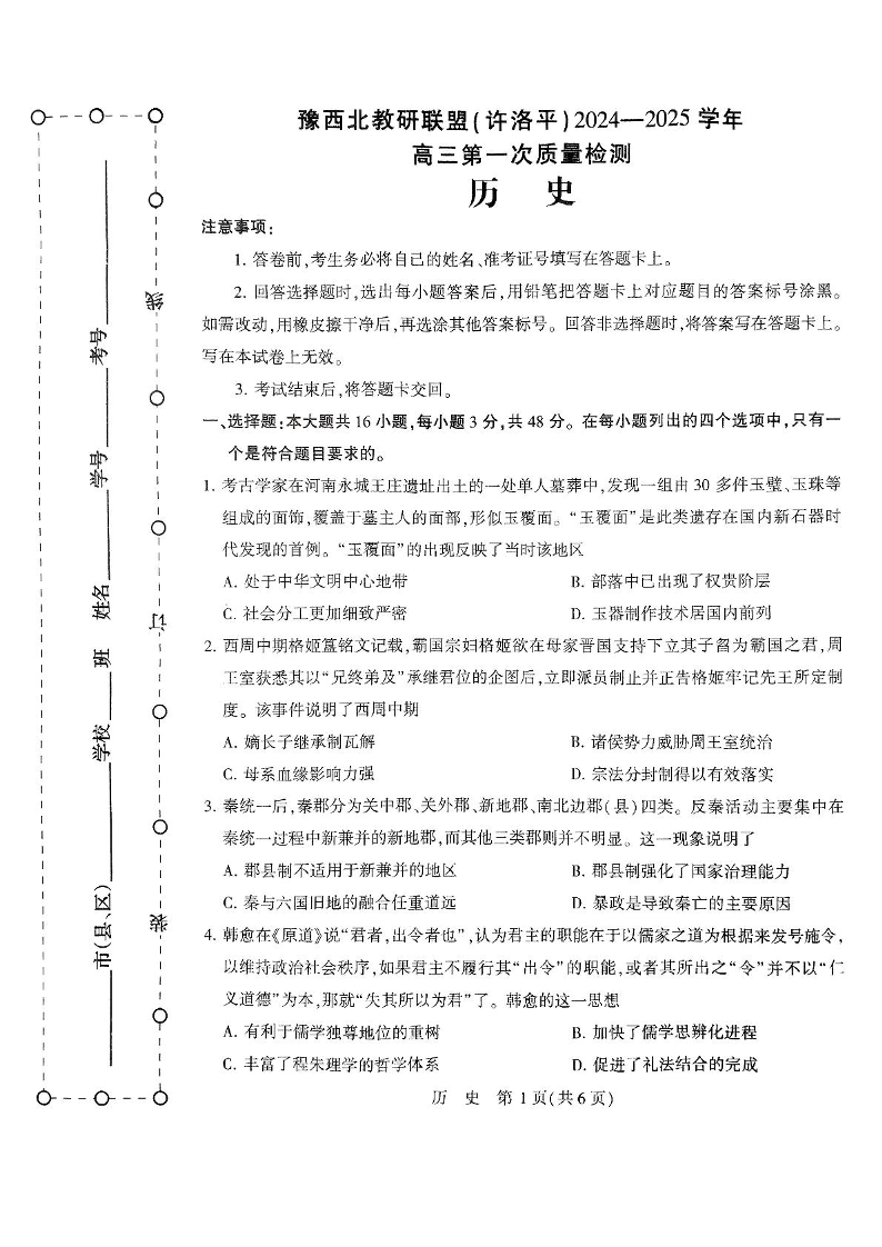 河南省豫西北教研联盟2025届高三上学期第一次质量检测历史
