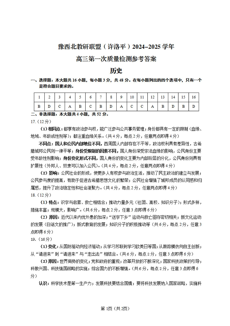 河南省豫西北教研联盟2025届高三上学期第一次质量检测历史答案