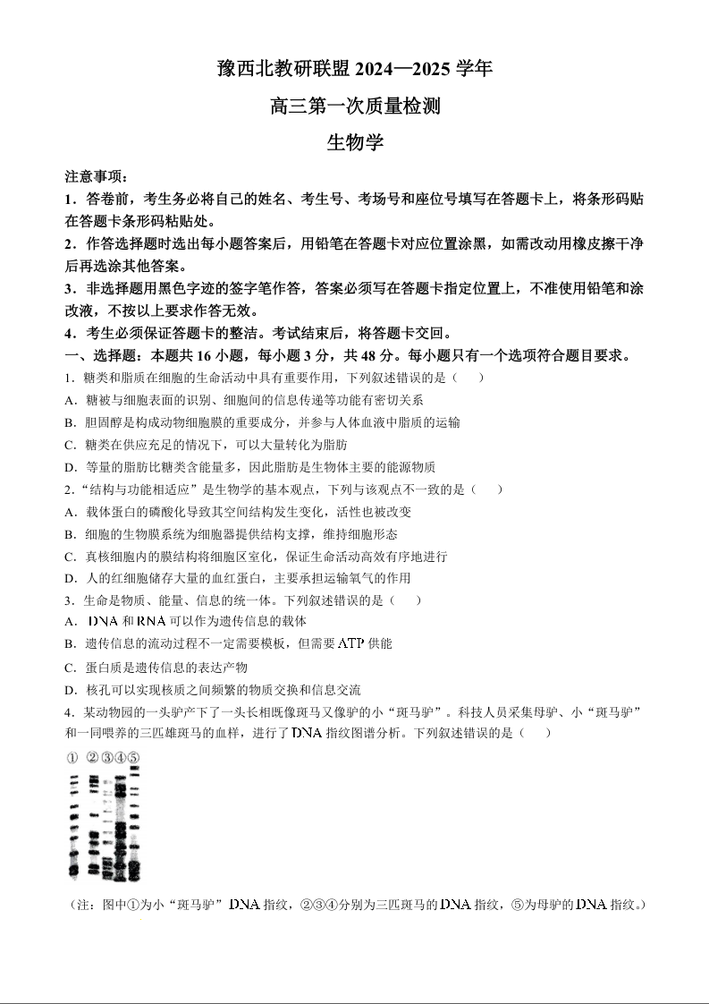 河南省豫西北教研联盟2025届高三上学期第一次质量检测生物
