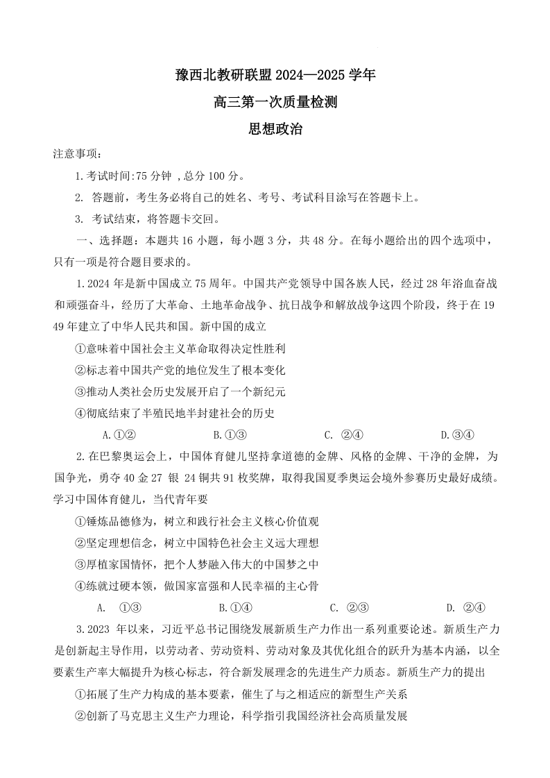 河南省豫西北教研联盟2025届高三上学期第一次质量检测政治+答案