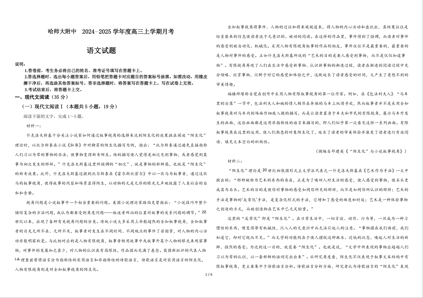 黑龙江省哈尔滨师范大学附属中学2025届高三上学期10月月考语文