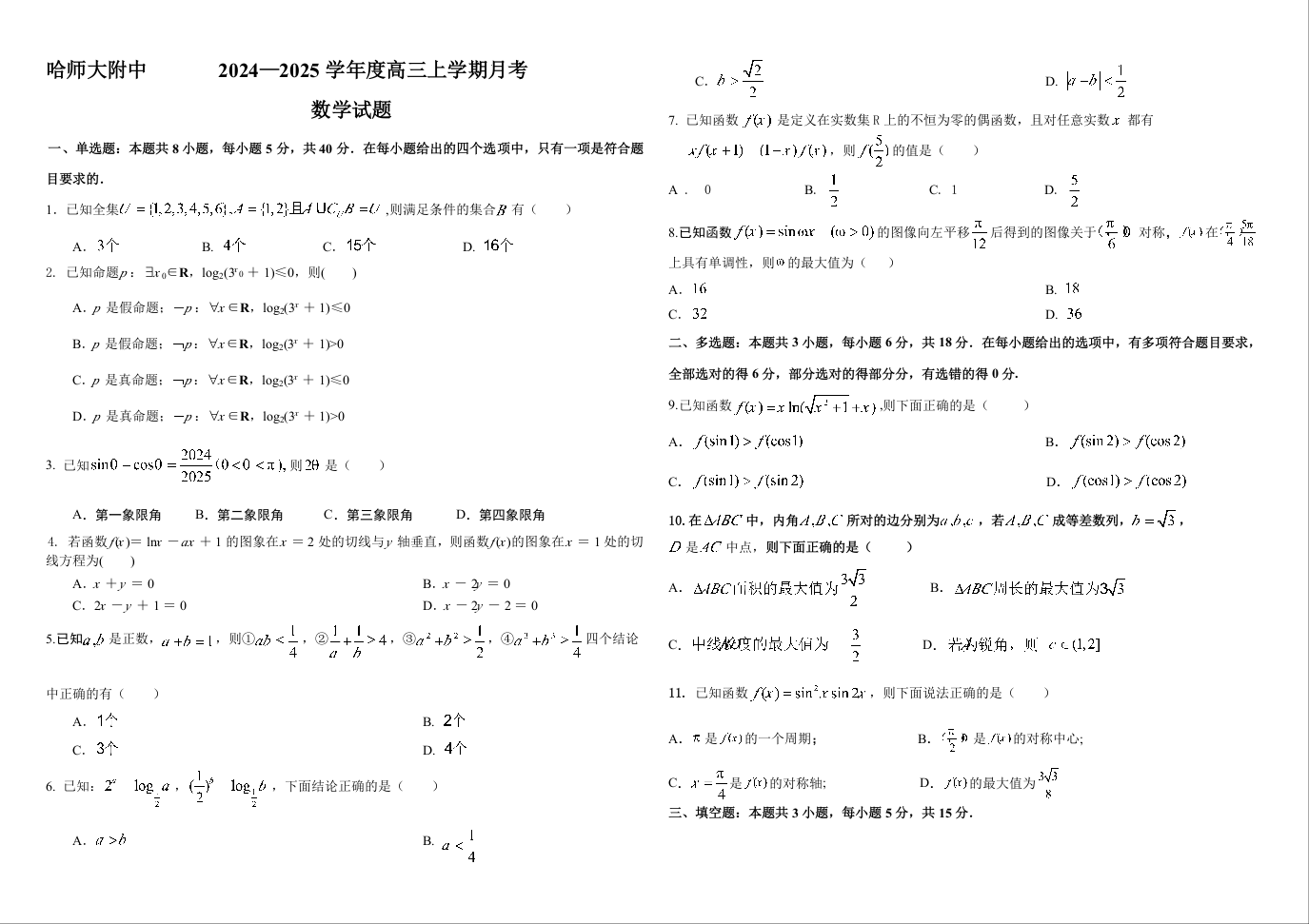 黑龙江省哈尔滨师范大学附属中学2025届高三上学期10月月考数学