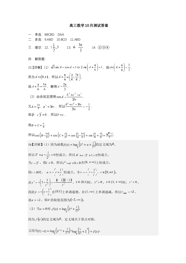黑龙江省哈尔滨师范大学附属中学2025届高三上学期10月月考数学答案