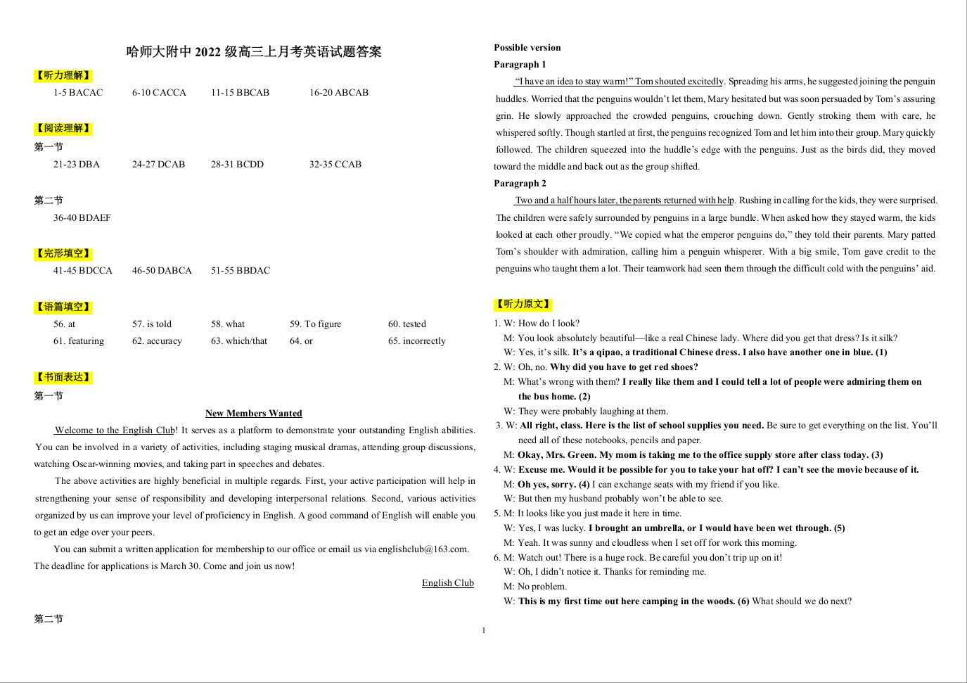 黑龙江省哈尔滨师范大学附属中学2025届高三上学期10月月考英语答案