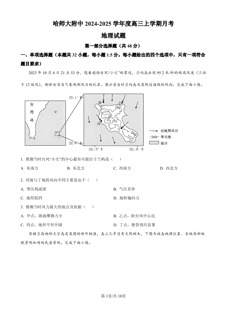 黑龙江省哈尔滨师范大学附属中学2025届高三上学期10月月考地理试题(原卷版)