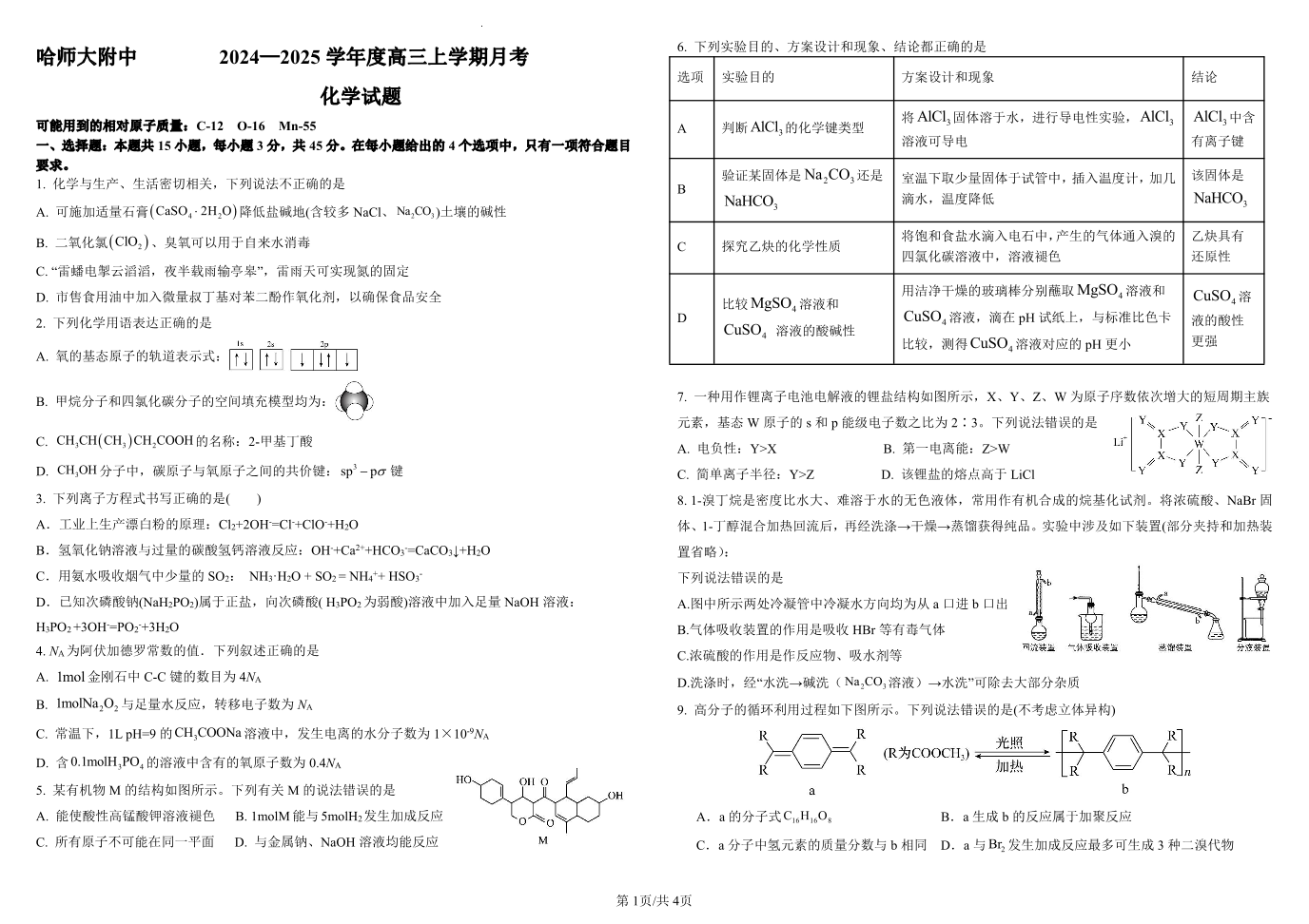 黑龙江省哈尔滨师范大学附属中学2025届高三上学期10月月考化学