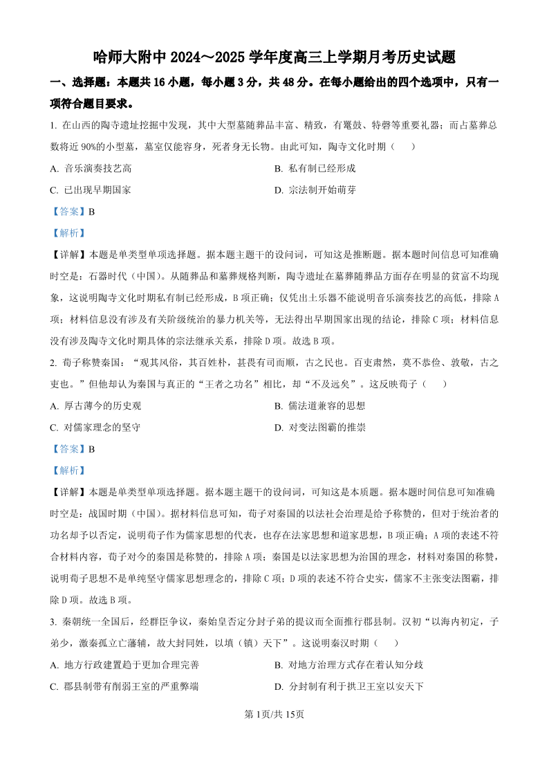 黑龙江省哈尔滨师范大学附属中学2025届高三上学期10月月考(解析版)