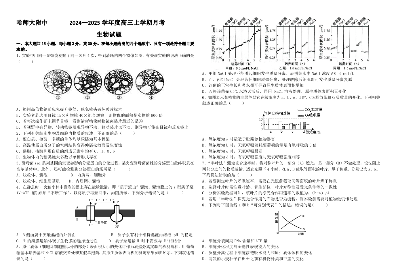 黑龙江省哈尔滨师范大学附属中学2025届高三上学期10月月考生物