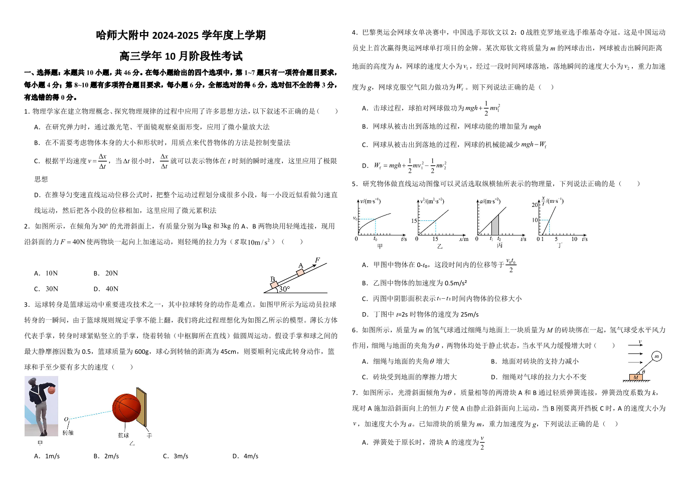 黑龙江省哈尔滨师范大学附属中学2025届高三上学期10月月考物理