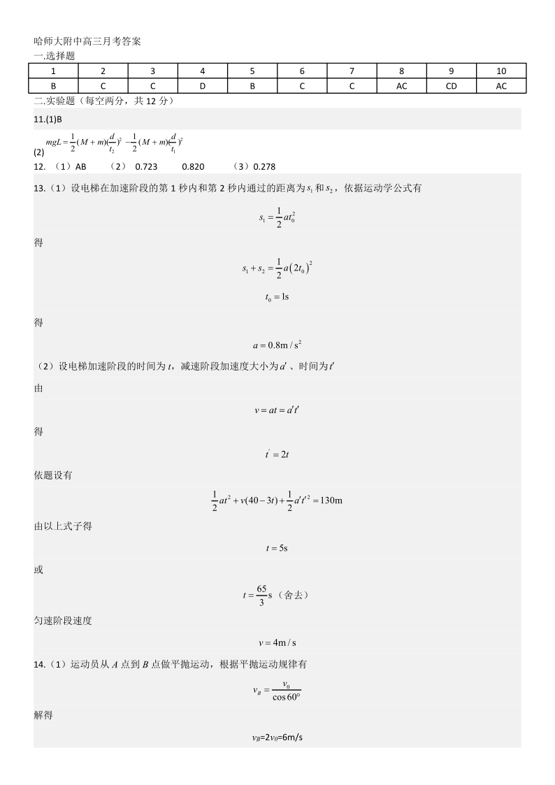 黑龙江省哈尔滨师范大学附属中学2025届高三上学期10月月考物理答案