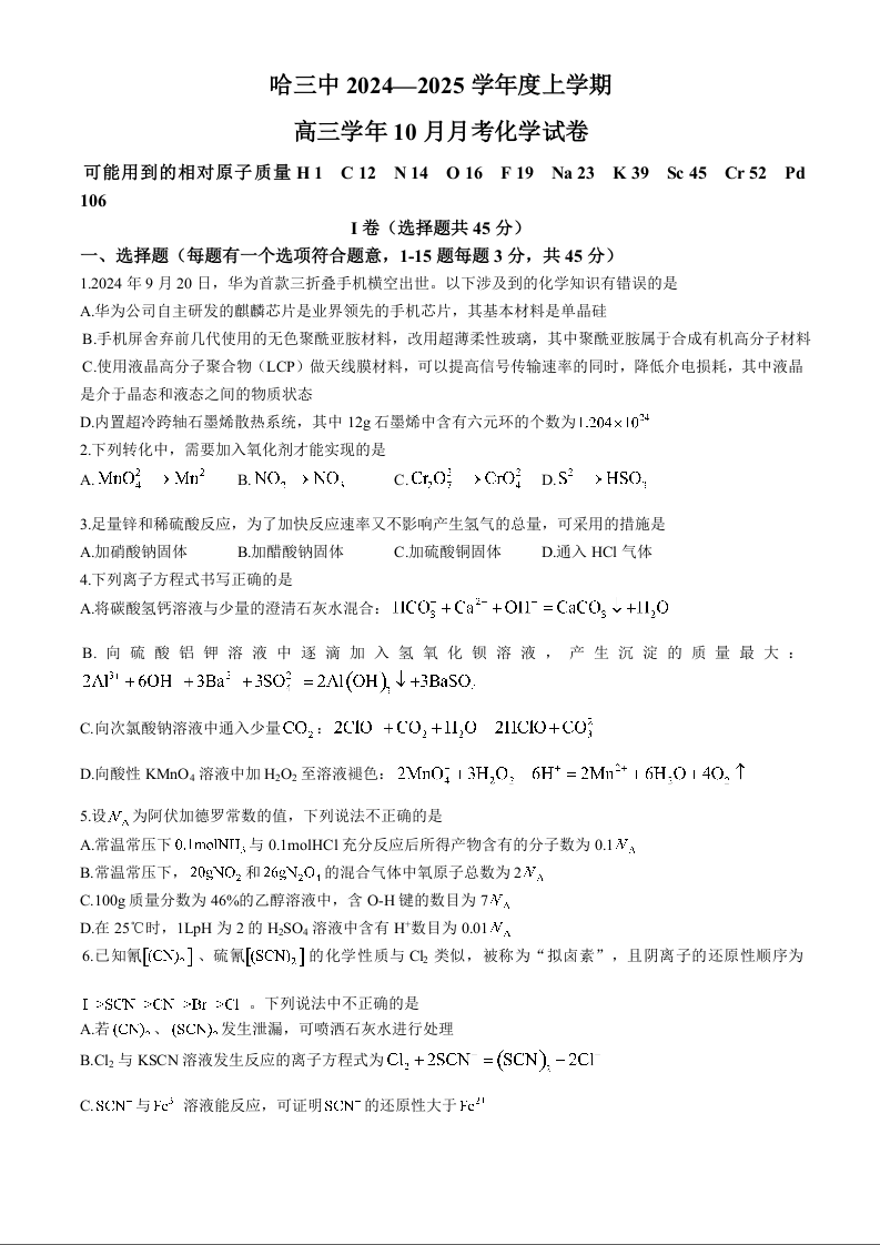 黑龙江省哈尔滨市第三中学校2025届高三上学期10月月考化学+答案
