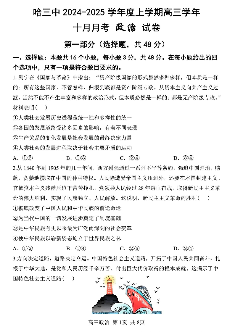 黑龙江省哈尔滨市第三中学校2025届高三上学期10月月考政治+答案